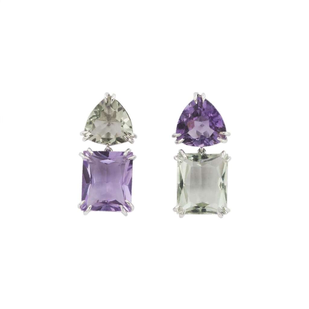 BRINCO DUPLO KANJU OURO BRANCO AMETISTA AMETISTA VERDE